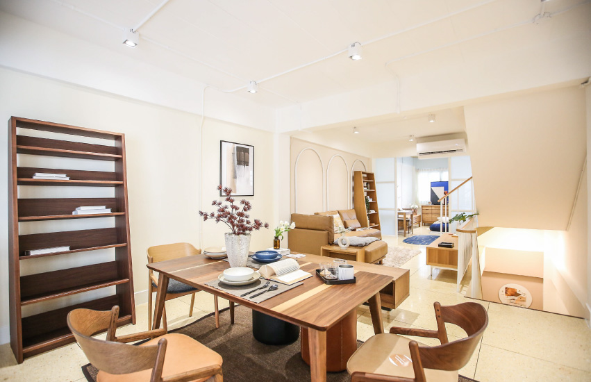 ประตูไม้บานโตผนวกหน้าต่างตีช่องกรุด้วยกระจกใสสะท้อนให้เห็นถึงภายใน มองผิวเผินโชว์รูม ฌ เฌอ ให้ความรู้สึกละม้ายคล้ายกับบ้านคนมากกว่าโชว์รูมเฟอร์นิเจอร์ที่เอาไว้ขายเครื่องเรือนตกแต่งบ้าน